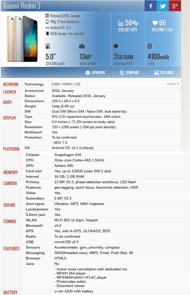 Setelah setahun digunakan, saya mencoba untuk me-review Xiaomi Redmi 3, ponsel ini telah saya gunakan selama satu tahun. Seri Redmi merupakan seri entri level untuk HP Xiaomi. Namun, untuk Xiaomi Redmi 3, saya tidak merasakan hp ini sebagai sebuah hp pemula. Dari list spesifikasi di bawah, menurut saya, HP ini bisa di kategorikan ke level menengah. Mari kita kupas satu persatu. Sebelumnya, mari kita simak spesifikasi lengkapnya dari GSMarena.